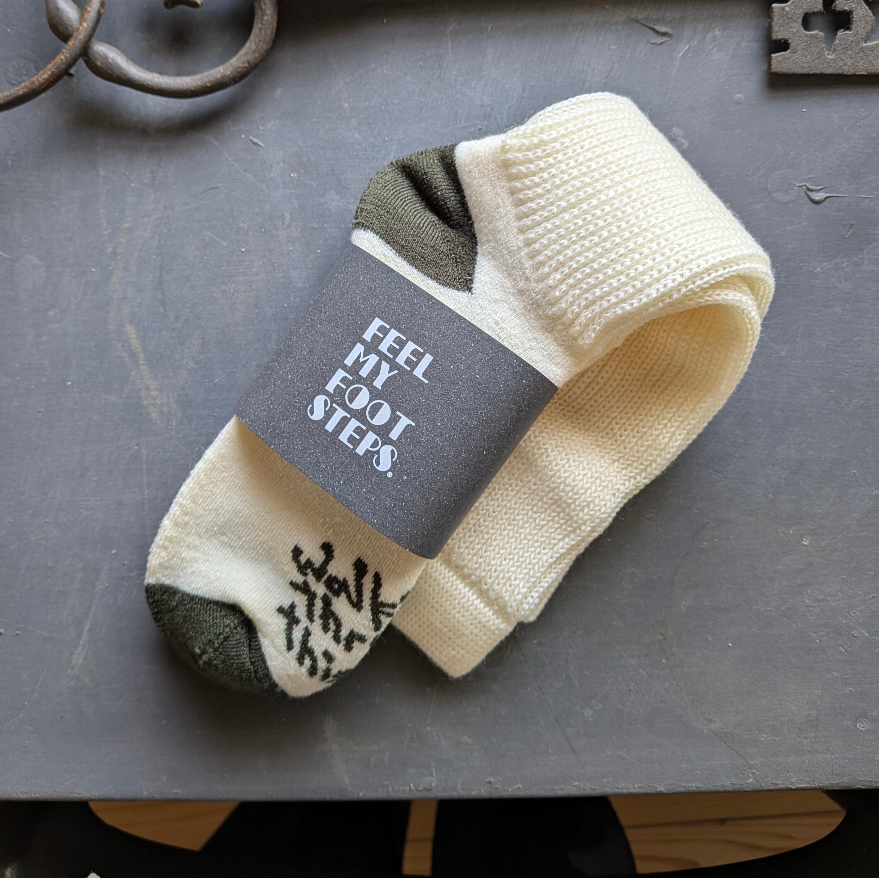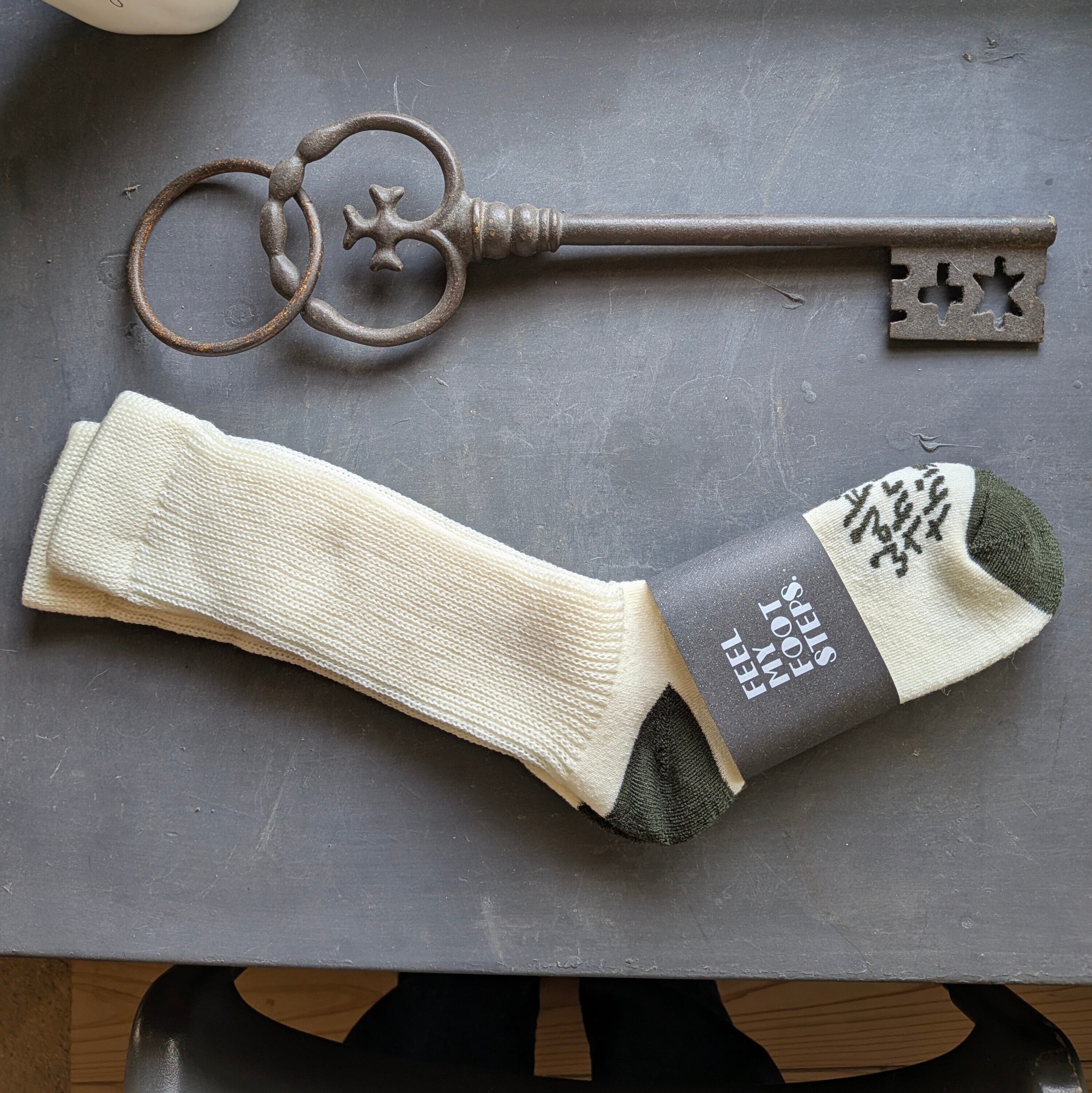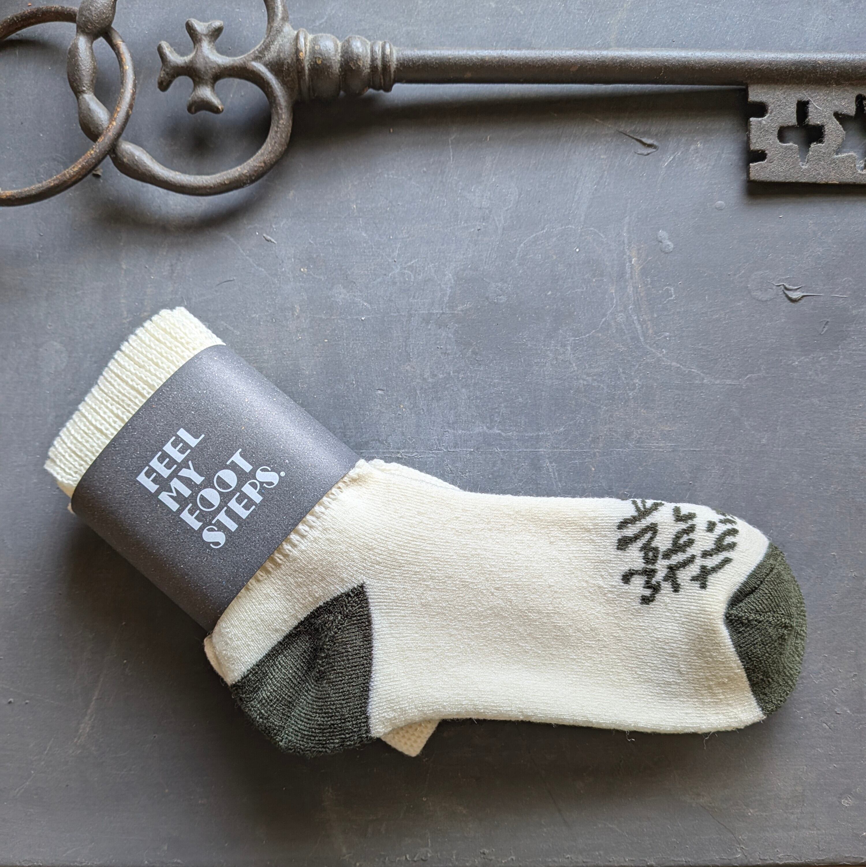 つま先にデザインされた直球なメッセージ●デザイン・品質アクリルとウールの長所を生かし織り交ぜることで、空気を内包させ温かさを約束すると同時に、ヘタれにくく洗濯後も乾きやすいハイブリッドな設計です。つま先に描かれた「○○○○」の英文テキストの直訳は「このくそったれな世の中を歩いていこうぜ!」決して綺麗な表現じゃないけれど、多かれ少なかれそんな気持ちになることありますよね(笑)それでも今日は始まるから、そんな時良かったら履いてください。●製法足首から下はすべてふかふかのパイル編みで仕上げています。ふかっとしたクッション性を持たせることで、長時間履いていても疲れにくい設計になっています。シティユース、アウトドア、ホームなど、暮らしのシーン別で使い分けてください。