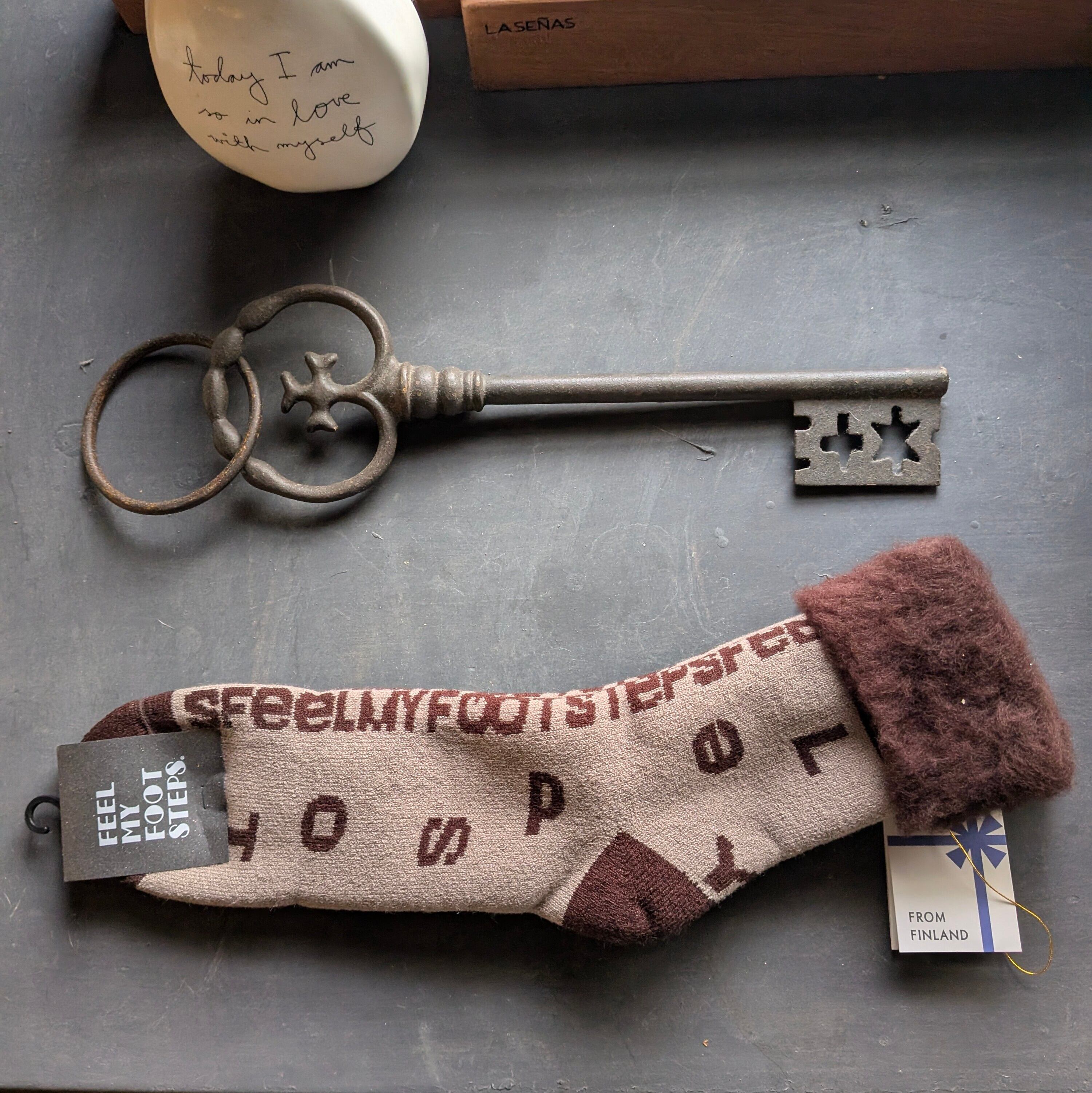 ブランドの世界観を表現したソックス●デザイン正面に「FEEL MY FOOTSTEPS = 足音を感じて」の文字。そして全体に散りばめられたアルファベットでブランドの世界観を表現しています。スポーティで都会的な雰囲気を、お家でも楽しんでいただきたい、そんなデザインです。テキスタイルアーティストのミズタユウジ氏がデザインしたフラッフィーソックスは右や左、後ろや前など、見る角度で表情が異なるユニークな柄です。アートのエッセンスを込めたデザインは「ギフトでもらった方が、また他の大切な誰かにギフトする」そんな幸せの輪が広がっていきそう。お家でのなにげないひとときがスペシャルな時間に!●品質・製法世界で1つだけ、オーダーメイドの起毛機で創られたフラッフィーソックスはふわふわで履いた瞬間「良いものだ」と実感できます。もともとヨーロッパ圏のみで導入できる特殊な起毛機を更にカスタマイズし、フラッフィーソックスのためにオーダーメイドしています。そんな機械を使い、職人が1足1足手作業で丁寧に起毛しています。肌側に起毛をほどこしていますが、あえてつま先だけ起毛しないことで、足先にきちんと重心がかかり、しっかりふみしめられるエ夫も加えました。つまりFEEL MY FOOTSTEPS のみで体験できる最高品質のルームソックスなのです。外側はメリヤス編み、中間はパイル編み、肌側は起毛の3重構造だからふかふかで足に優しいコージーな厚みになっています。アクリル・ナイロン・ウールを混用することで汗を程よく吸湿し余分な水分を放出しムレが気になりません。またウールは天然の消臭効果が備わっています。ウールは温かい反面強度ではややたよりないデリケートな特徴がありますが、繰り返しのお洗濯にも耐えられるようナイロンを練りこみ丈夫な作りにしました。※ 製造工程上「目とび」という現象が発生する場合がありますが不良ではございません。