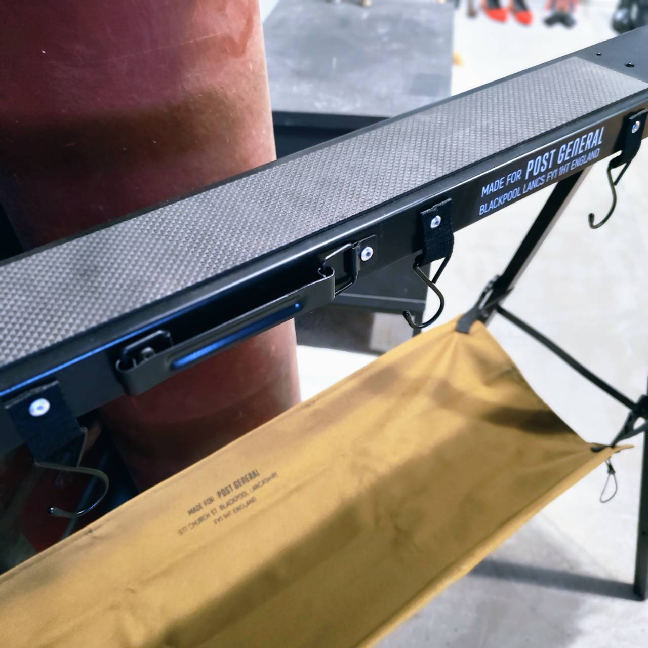 専用カバーの四角に、ベルト調整付バッグルがついていて カンタンにSAWHORSE&HANGERに取り付け可能!