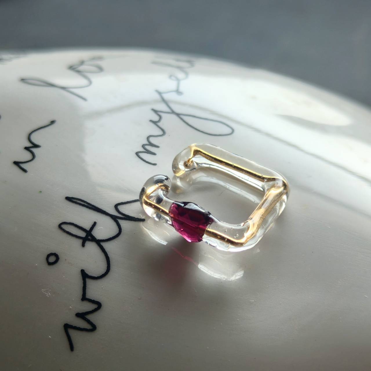 全体を樹脂でコーティングしておりますので透明感があり、繊細な雰囲気に仕上がっております。天然石はイヤーカフの中心についておりますので着けたときに耳の縁側に見える感じになります。